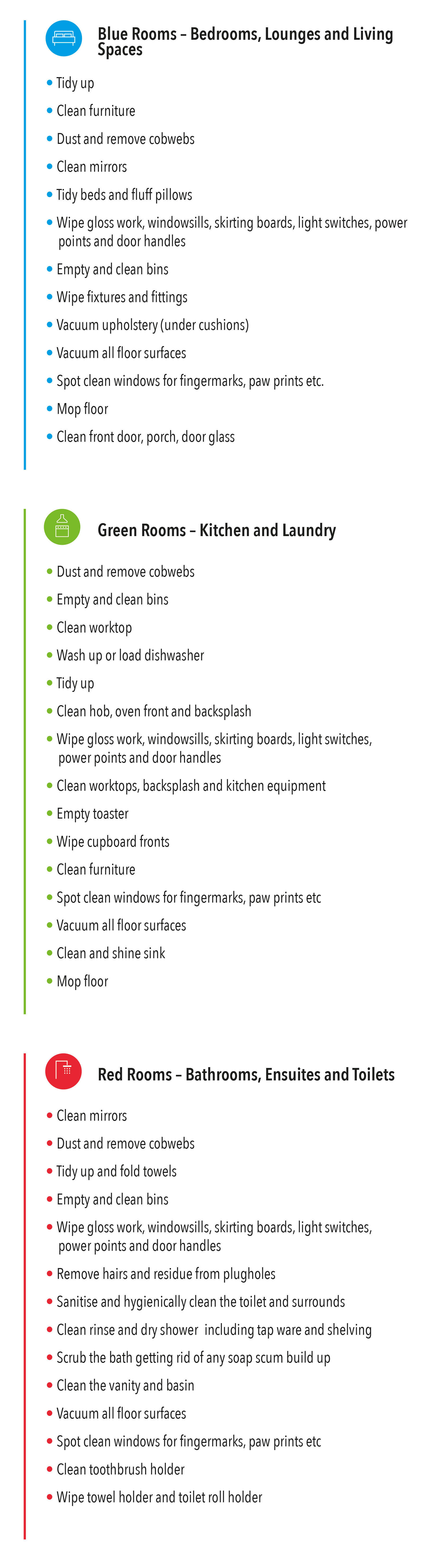 Cleaning can be subjective as everyone has a different perception of what ‘clean’ is and we understand that things can vary from week to week. This systematic approach ensures everyone knows what to do, and what will be done.